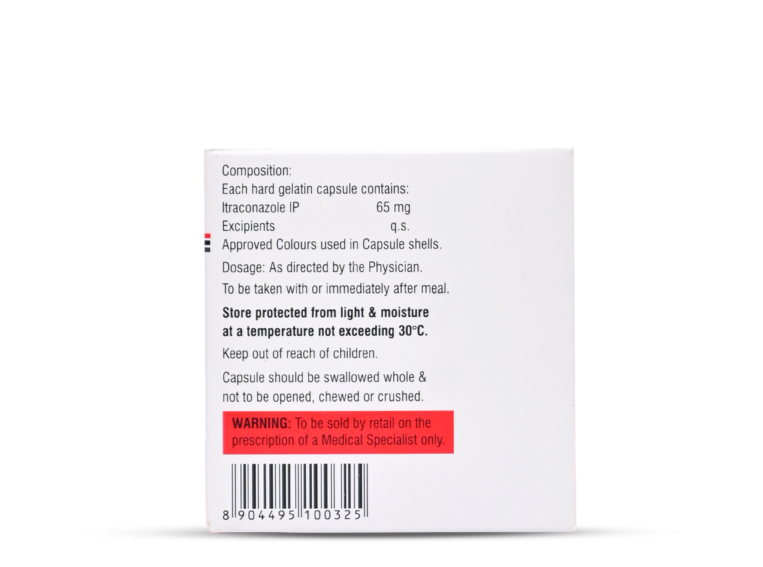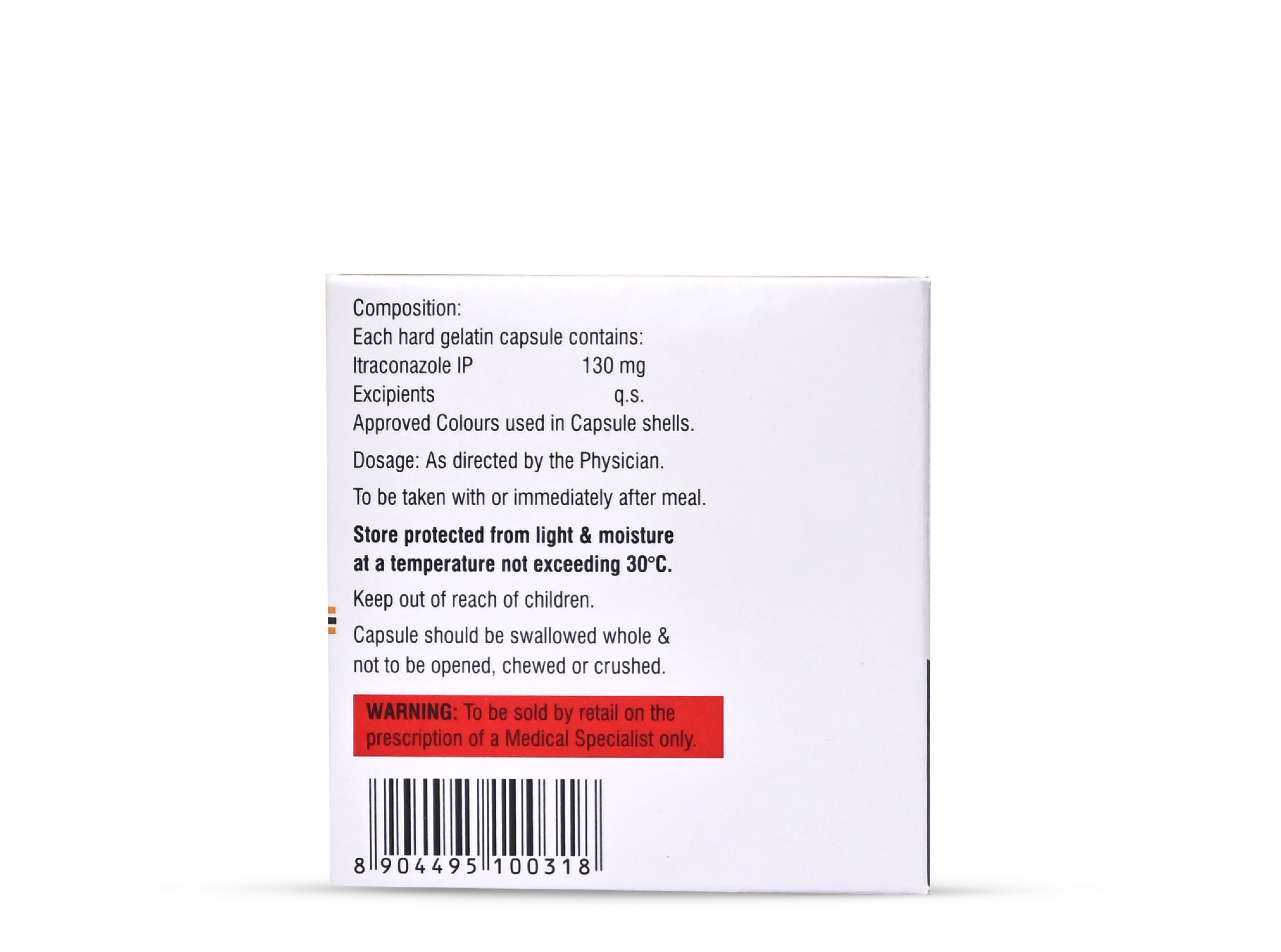 Each hard gelatin capsule contains:Itraconazole IP 65mg / 130mgExcipients: q.s.Approved colours used in capsule shells.Store protected from light & moisture at a temperature not exceeding 30°C.